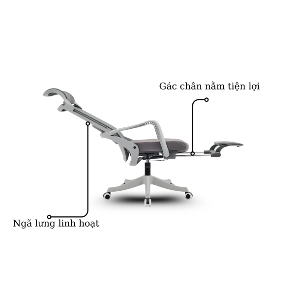 Ghế được trang bị phần gác chân có thể kéo ra hoặc thu gọn dễ dàng. Khi cần thư giãn, bạn có thể ngả lưng kết hợp với gác chân để có tư thế nằm thoải mái, giúp giảm căng thẳng và tái tạo năng lượng nhanh chóng.