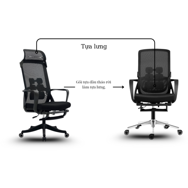 Gối tựa đầu được thiết kế thông minh, có thể tháo rời để sử dụng làm gối tựa lưng khi cần. Nhờ đó, ghế có thể linh hoạt đáp ứng nhiều tư thế ngồi khác nhau, phù hợp với nhu cầu làm việc, nghỉ ngơi hoặc giải trí.