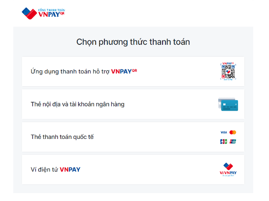 Cổng thanh toán VNPAY là giải pháp thanh toán do Công ty Cổ phần Giải pháp Thanh toán Việt Nam (VNPAY) phát triển. Khách hàng sử dụng thẻ/tài khoản ngân hàng, tính năng QR Pay/VNPAY-QR được tích hợp sẵn trên ứng dụng Mobile Banking của các ngân hàng hoặc Ví điện tử liên kết để thanh toán các giao dịch và nhập mã giảm giá (nếu có)